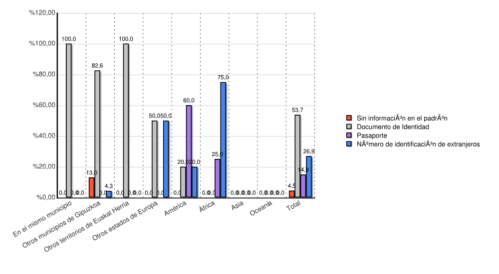 | Continente | Sin información en el padrón | Documento de Identidad | Pasaporte | Número de identificación de extranjeros | Total | |||||