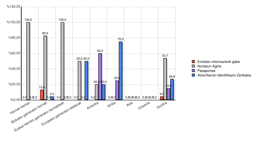 | Kontinentea | Erroldan informaziorik gabe | Nortasun Agiria | Pasaportea | Atzerritarren Identifikazio Zenbakia | Guztira | |||||