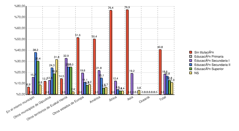 | Continente | Sin titulación | Educación Primaria | Educación Secundaria I | Educación Secundaria II | Educación Superior | NS | Total | |||||||