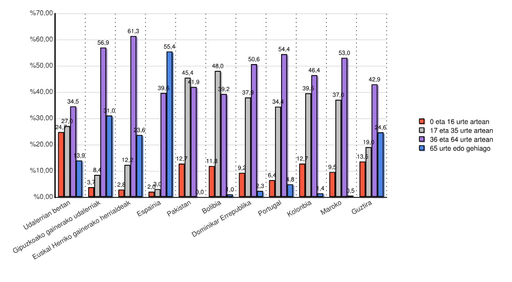 | Euskal Herriko gainerako herrialdeak | 86 | 2,8 | 369 | 12,2 | 1.852 | 61,3 | 714 | 23,6 | 3.021 | 100,0 |