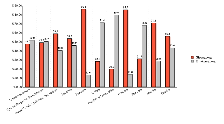 | Udalerrian bertan | 49 | 48,0 | 53 | 52,0 | 102 | 100,0 |