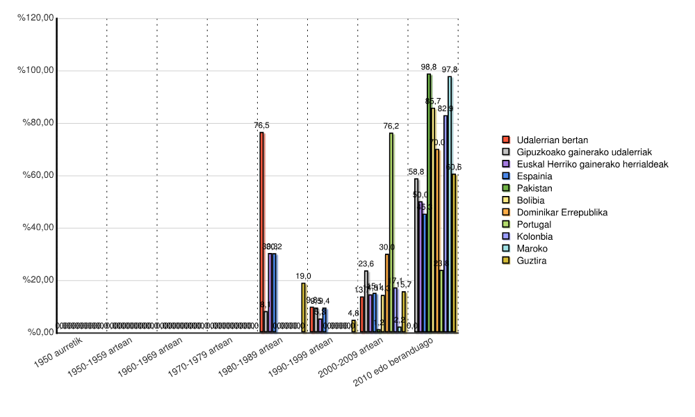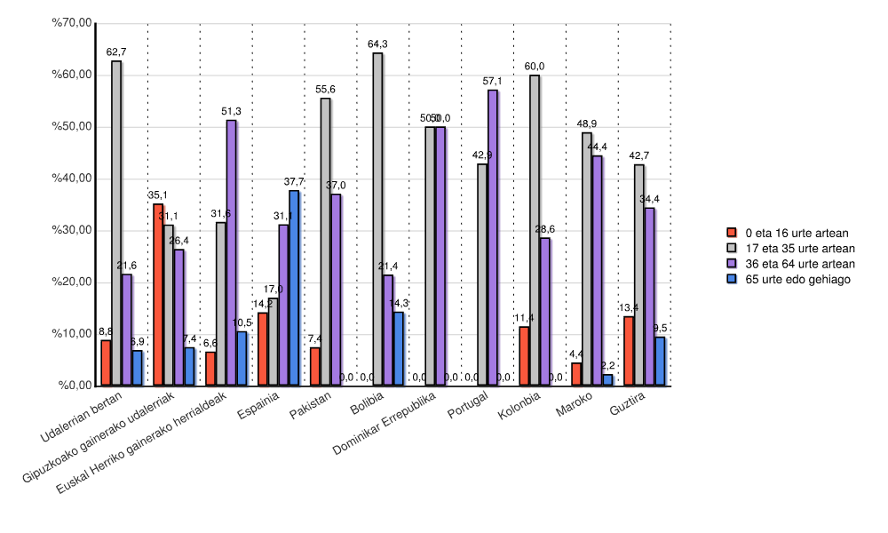 | Euskal Herriko gainerako herrialdeak | 0 | 0,0 | 0 | 0,0 | 0 | 0,0 | 0 | 0,0 | 76 | 100,0 |