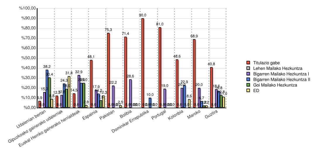 | Estatua | Titulazio gabe | Lehen Mailako Hezkuntza | Bigarren Mailako Hezkuntza I | Bigarren Mailako Hezkuntza II | Goi Mailako Hezkuntza | ED | Guztira | |||||||