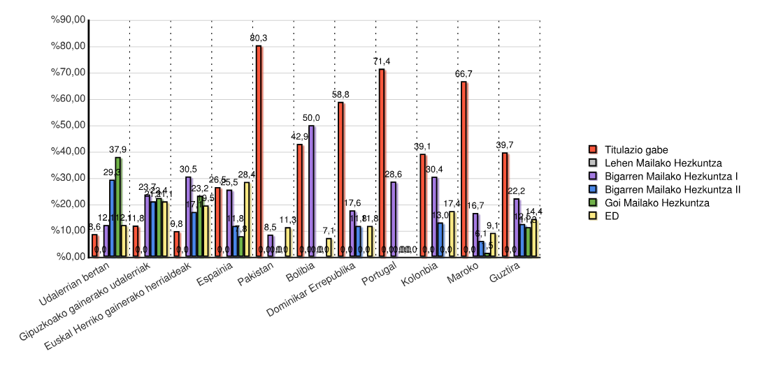 | Estatua | Titulazio gabe | Lehen Mailako Hezkuntza | Bigarren Mailako Hezkuntza I | Bigarren Mailako Hezkuntza II | Goi Mailako Hezkuntza | ED | Guztira | |||||||