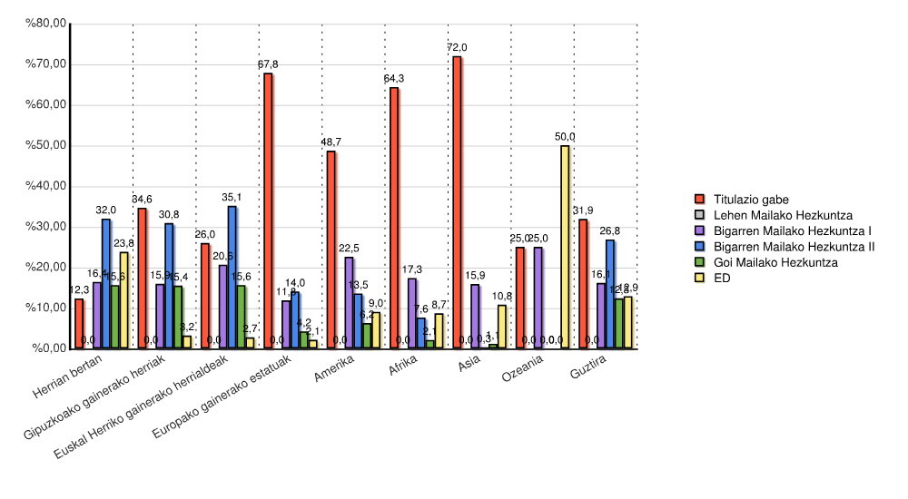 | Kontinentea | Titulazio gabe | Lehen Mailako Hezkuntza | Bigarren Mailako Hezkuntza I | Bigarren Mailako Hezkuntza II | Goi Mailako Hezkuntza | ED | Guztira | |||||||