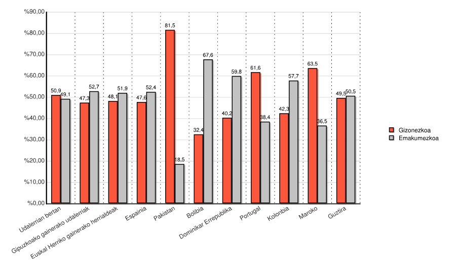 | Euskal Herriko gainerako herrialdeak | 1.454 | 48,1 | 1.567 | 51,9 | 3.021 | 100,0 |