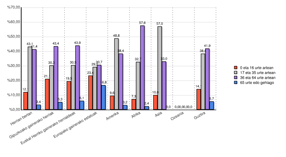 | Kontinentea | 0 eta 16 urte artean | 17 eta 35 urte artean | 36 eta 64 urte artean | 65 urte edo gehiago | Guztira | |||||