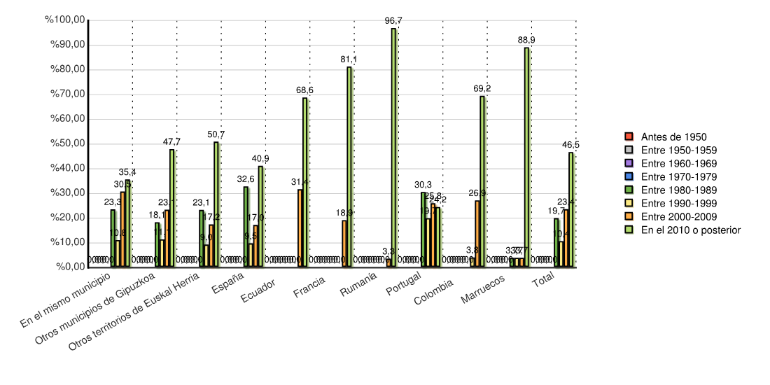 | Otros municipios de Gipuzkoa | 3.683 | 58,7 | 5.269 | 36,0 | 8.510 | 42,1 | 9.541 | 54,2 | 2.857 | 45,9 | 2.300 | 37,3 | 31.372 | 43,8 |