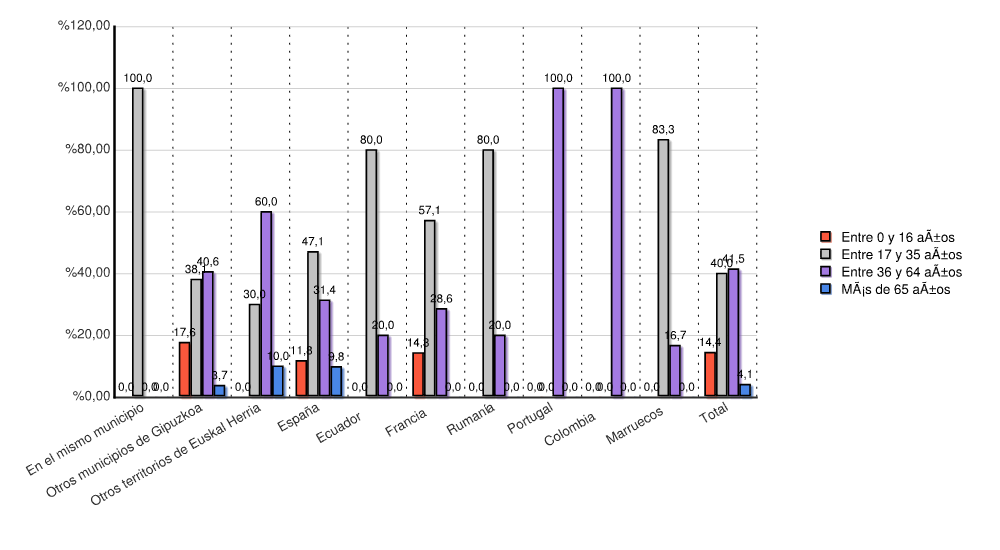 | Otros municipios de Gipuzkoa | 1 | 0,3 | 18 | 5,6 | 35 | 10,8 | 107 | 33,1 | 106 | 32,8 | 56 | 17,3 | 323 | 100,0 |