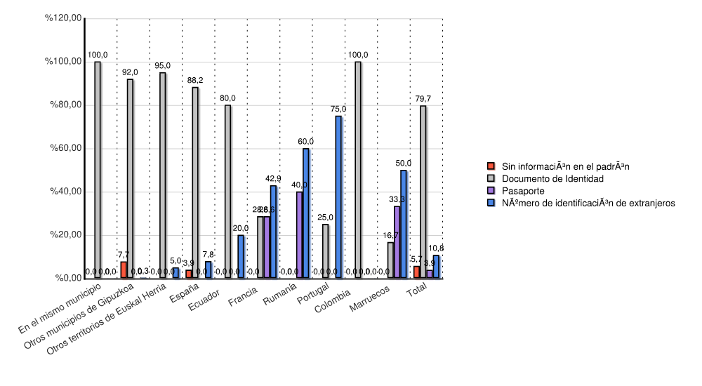 | Estado | Sin información en el padrón | Documento de Identidad | Pasaporte | Número de identificación de extranjeros | Total | |||||