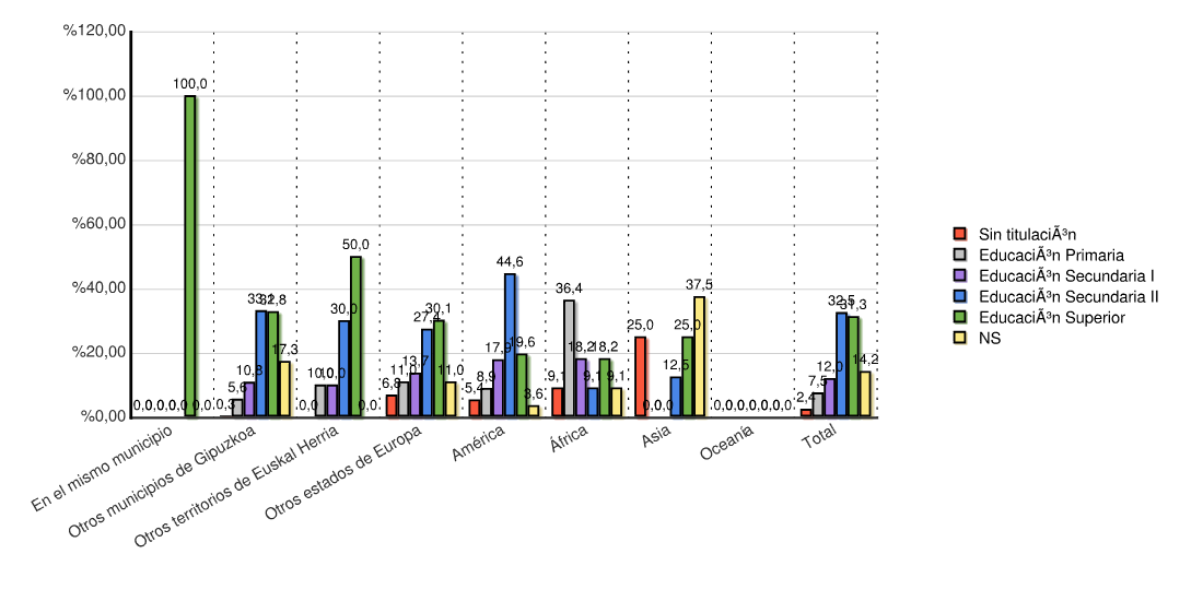 | Continente | Sin titulación | Educación Primaria | Educación Secundaria I | Educación Secundaria II | Educación Superior | NS | Total | |||||||