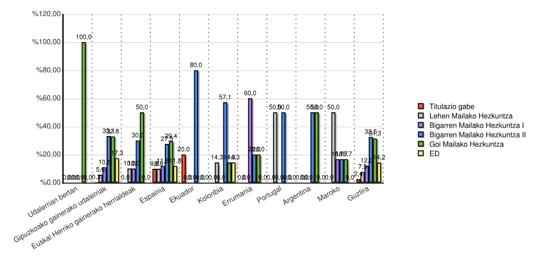 | Estatua | Titulazio gabe | Lehen Mailako Hezkuntza | Bigarren Mailako Hezkuntza I | Bigarren Mailako Hezkuntza II | Goi Mailako Hezkuntza | ED | Guztira | |||||||
