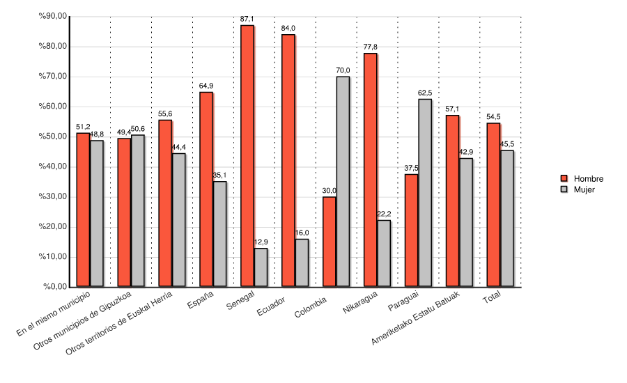 | Otros territorios de Euskal Herria | 35 | 55,6 | 28 | 44,4 | 63 | 100,0 |