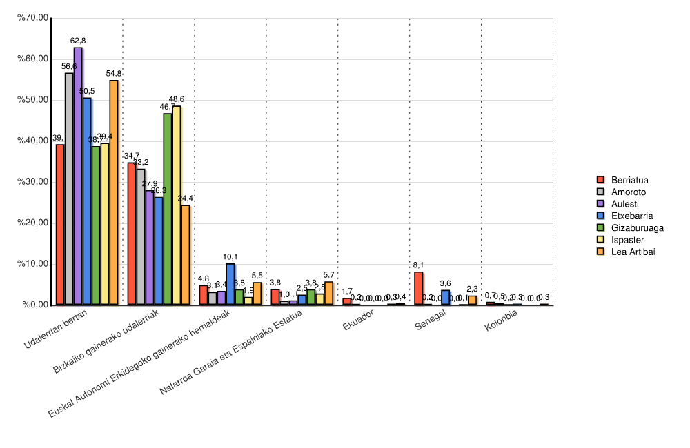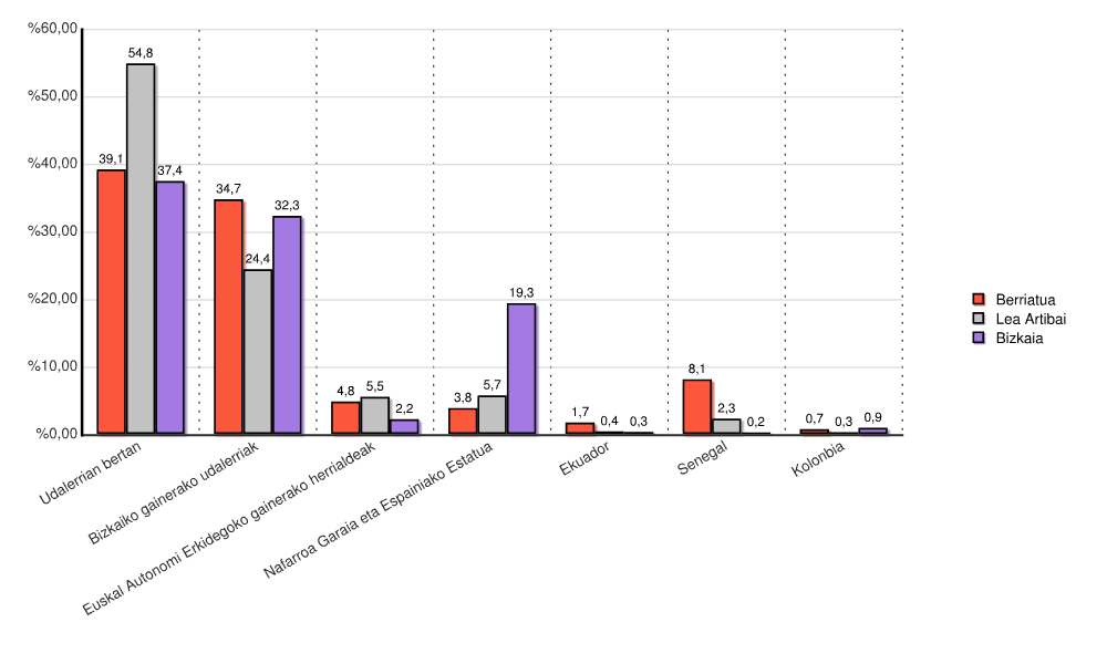 | Udalerrian bertan | 14.213 | 54,8 | 488 | 39,1 | 237 | 56,6 | 407 | 62,8 | 390 | 50,5 | 82 | 38,7 | 286 | 39,4 | 3.933 | 54,2 | 2.514 | 51,0 | 139 | 32,2 | 166 | 36,1 | 5.480 | 65,3 | 91 | 21,3 |