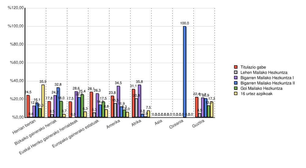 | Kontinentea | Titulazio gabe | Lehen Mailako Hezkuntza | Bigarren Mailako Hezkuntza I | Bigarren Mailako Hezkuntza II | Goi Mailako Hezkuntza | 16 urtez azpikoak | Guztira | |||||||