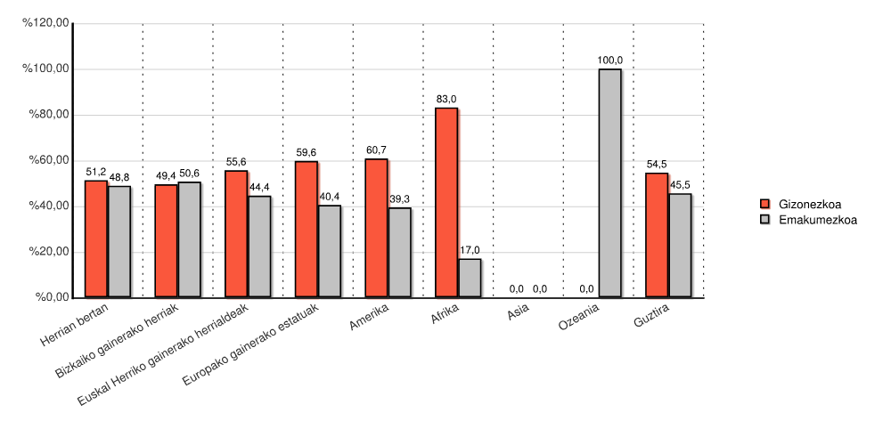 | Euskal Herriko gainerako herrialdeak | 35 | 55,6 | 28 | 44,4 | 63 | 100,0 |