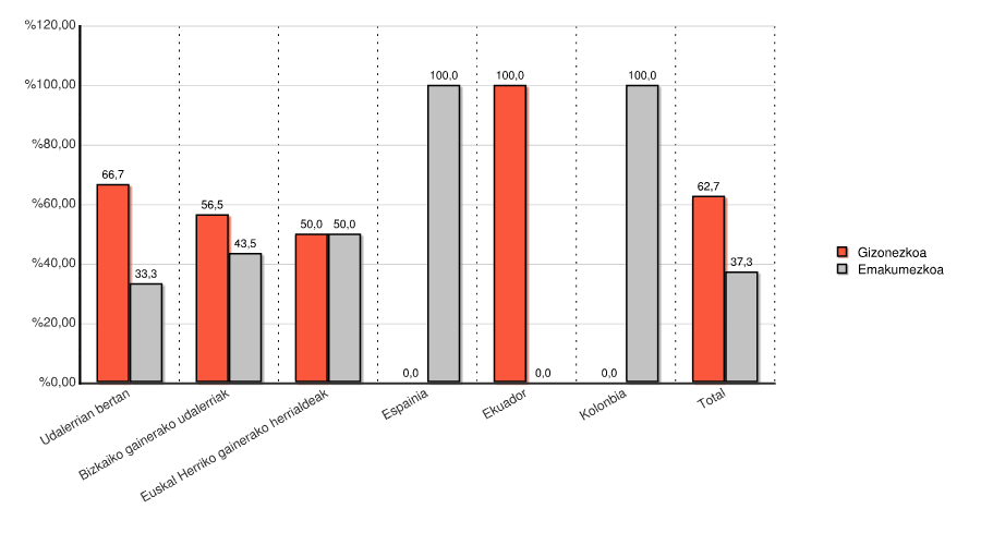 | Udalerrian bertan | 4 | 66,7 | 2 | 33,3 | 6 | 100,0 |