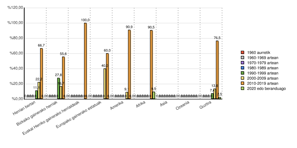 | Euskal Herriko gainerako herrialdeak | 0 | 0,0 | 0 | 0,0 | 0 | 0,0 | 0 | 0,0 | 0 | 0,0 | 0 | 0,0 | 1 | 100,0 | 0 | 0,0 | 1 | 100,0 |