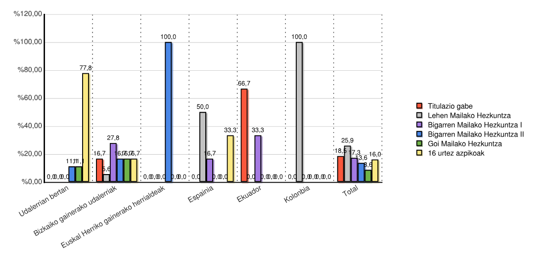 | Estatua | Titulazio gabe | Lehen Mailako Hezkuntza | Bigarren Mailako Hezkuntza I | Bigarren Mailako Hezkuntza II | Goi Mailako Hezkuntza | 16 urtez azpikoak | Guztira | |||||||
