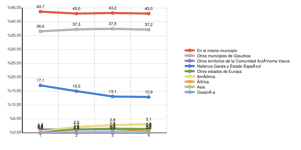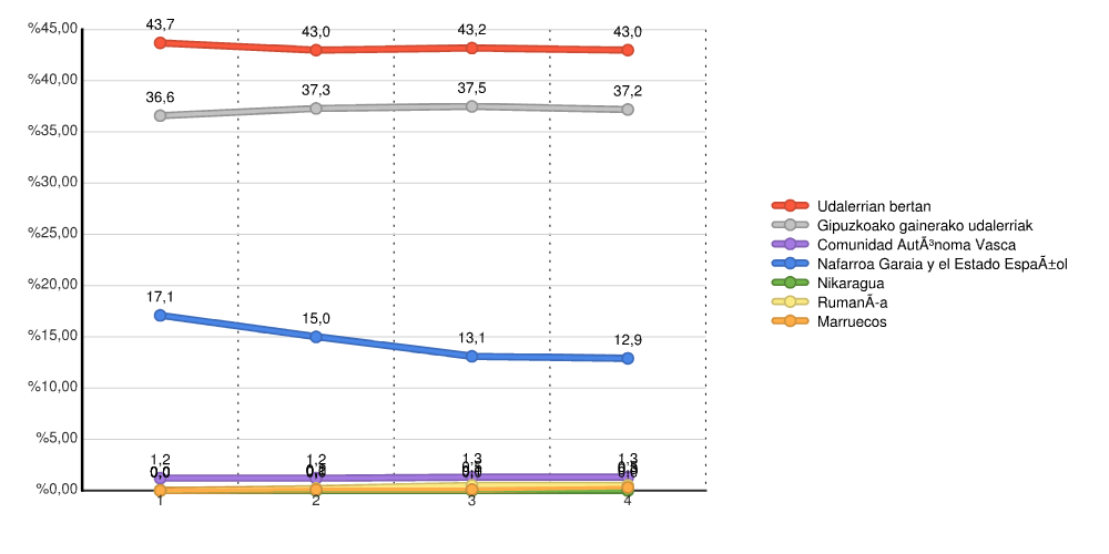 | Udalerrian bertan | 2.352 | 43,7 | 2.458 | 43,0 | 2.633 | 43,2 | 2.651 | 43,0 |