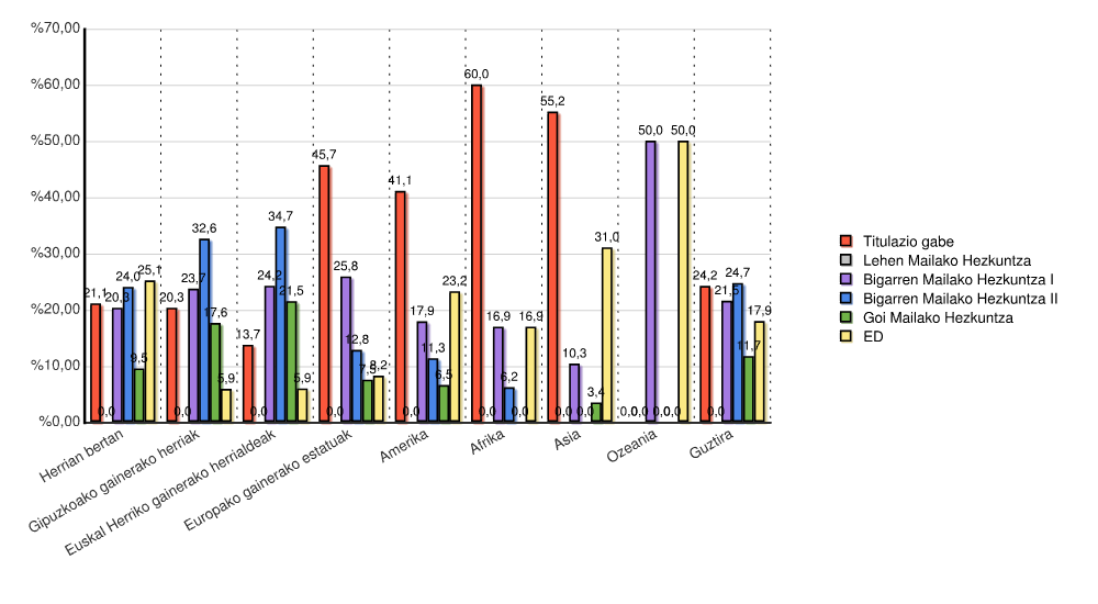 | Estatua | Titulazio gabe | Lehen Mailako Hezkuntza | Bigarren Mailako Hezkuntza I | Bigarren Mailako Hezkuntza II | Goi Mailako Hezkuntza | ED | Guztira | |||||||