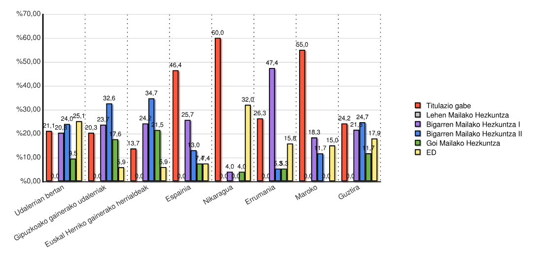 | Estatua | Titulazio gabe | Lehen Mailako Hezkuntza | Bigarren Mailako Hezkuntza I | Bigarren Mailako Hezkuntza II | Goi Mailako Hezkuntza | ED | Guztira | |||||||