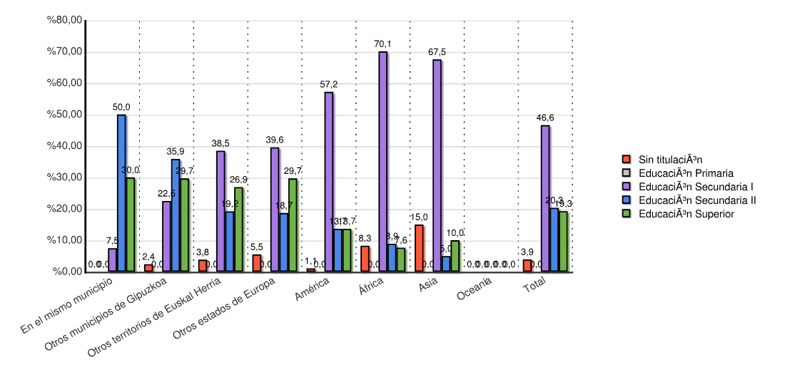 | Continente | Sin titulación | Educación Secundaria I | Educación Primaria | Educación Secundaria II | Educación Superior | Menores de 16 años | Total | |||||||