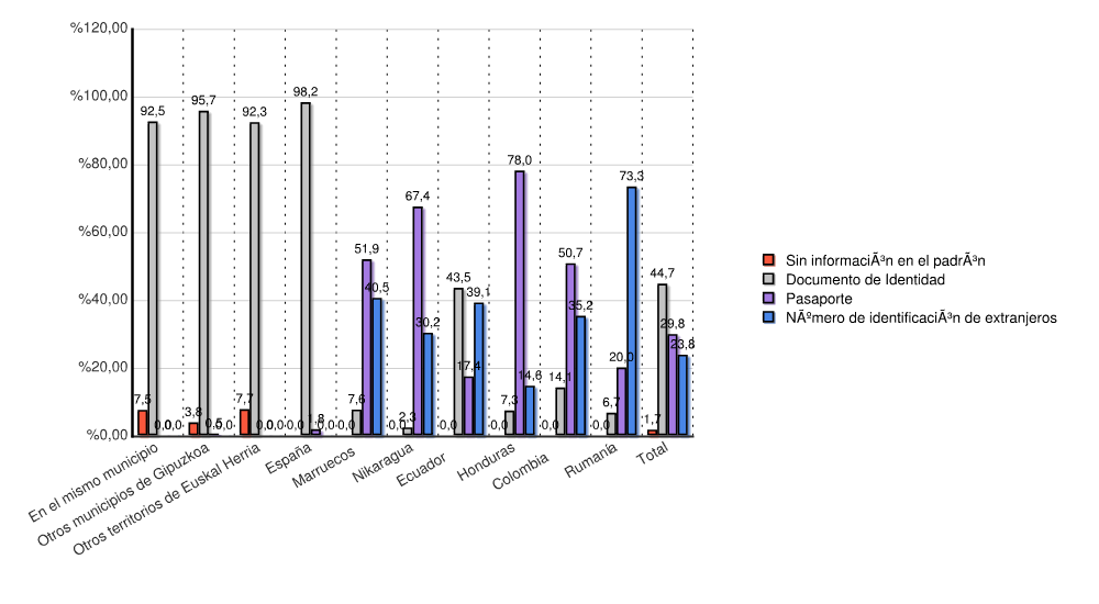 | Estado | Sin información en el padrón | Documento de Identidad | Pasaporte | Número de identificación de extranjeros | Total | |||||