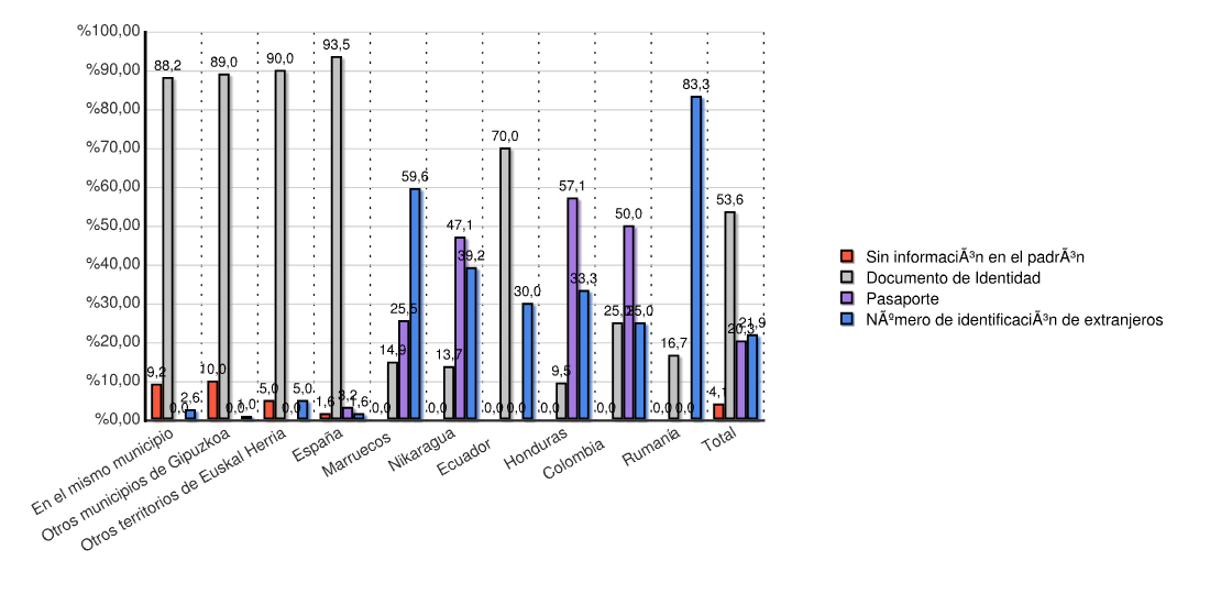 | Estado | Sin información en el padrón | Documento de Identidad | Pasaporte | Número de identificación de extranjeros | Total | |||||