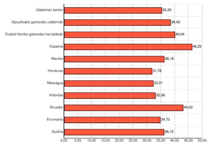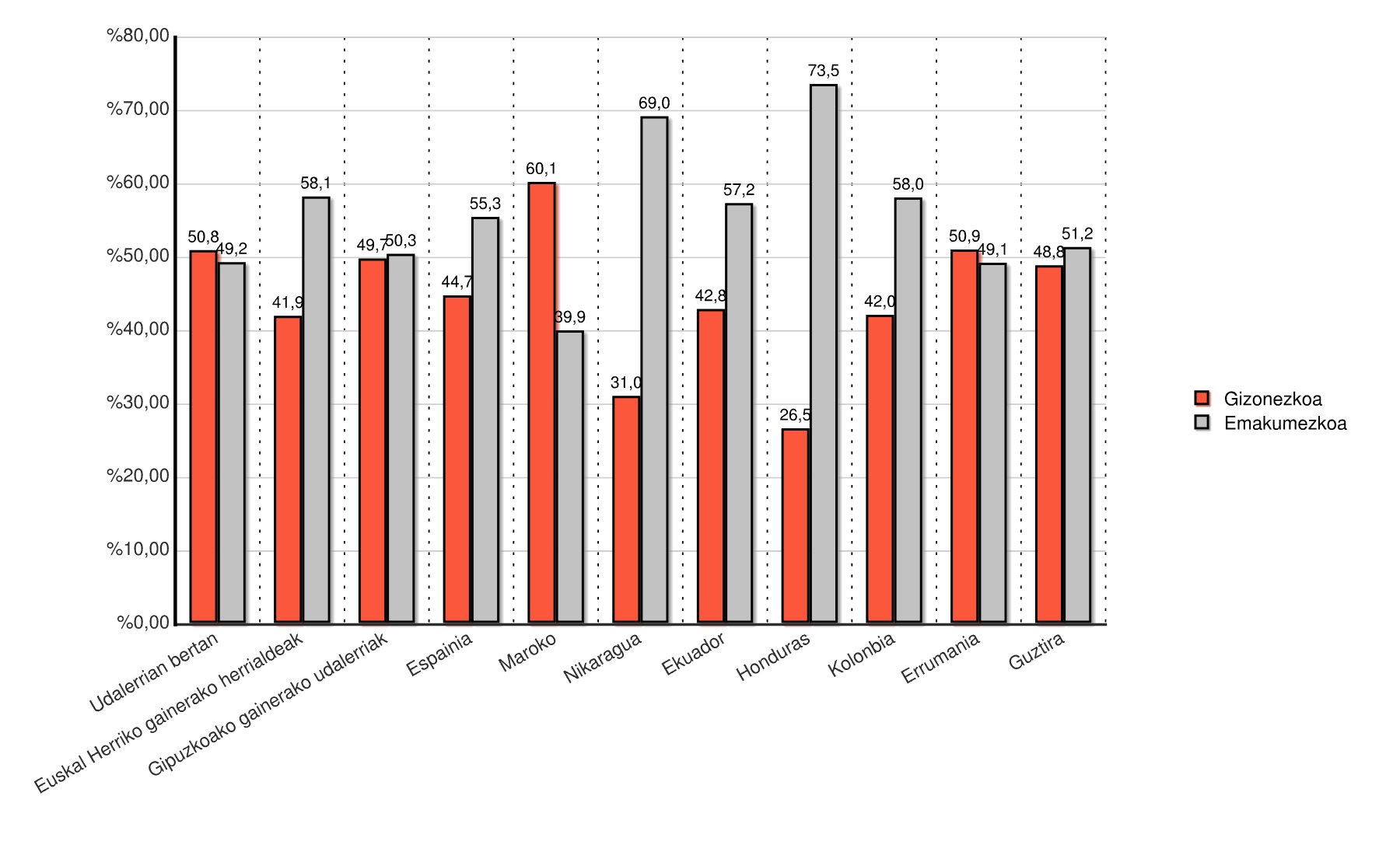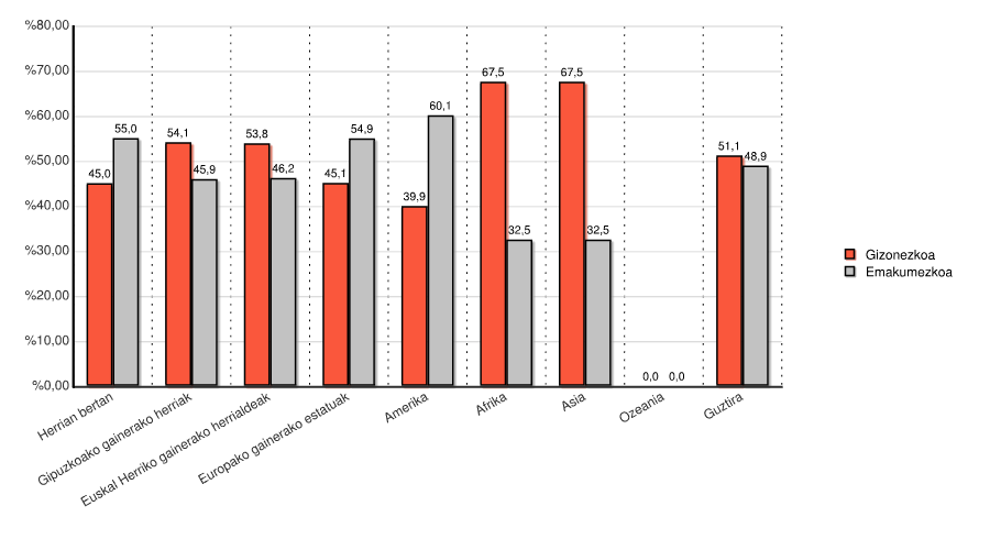 | Euskal Herriko gainerako herrialdeak | 319 | 41,9 | 443 | 58,1 | 762 | 100,0 |