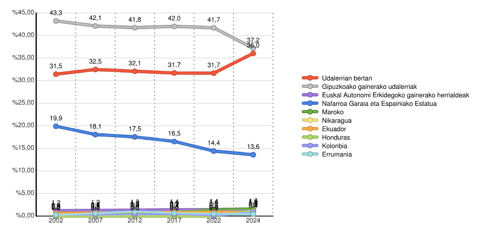 | Gipuzkoako gainerako herriak | 8.162 | 43,7 | 8.270 | 43,3 | 8.124 | 42,1 | 8.408 | 42,0 | 8.502 | 41,7 | 7.565 | 37,2 |