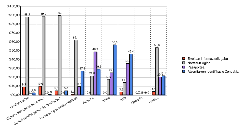 | Kontinentea | Erroldan informaziorik gabe | Nortasun Agiria | Pasaportea | Atzerritarren Identifikazio Zenbakia | Guztira | |||||