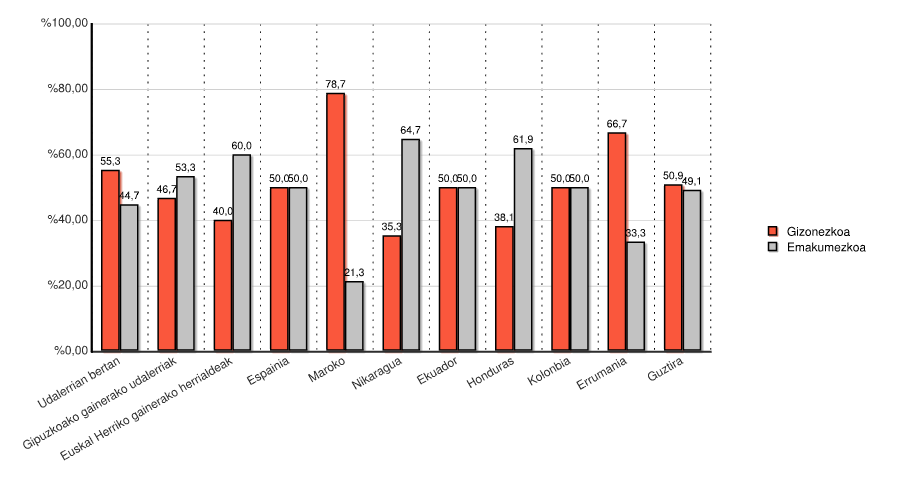 | Gipuzkoako gainerako herriak | 98 | 46,7 | 112 | 53,3 | 210 | 100,0 |
