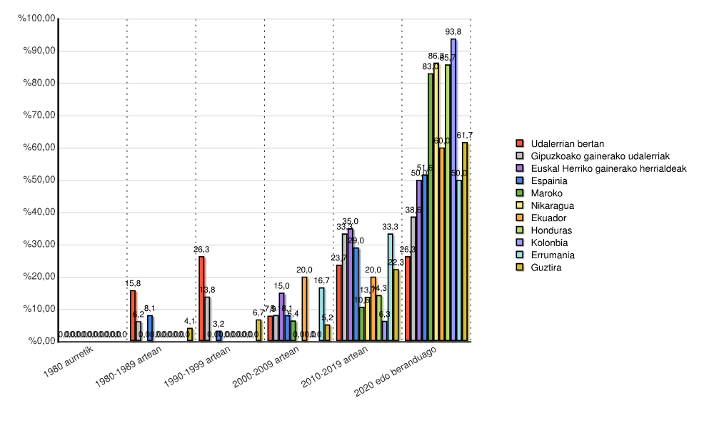 | Euskal Herriko gainerako herrialdeak | 20 | 100,0 | 0 | 0,0 | 0 | 0,0 | 0 | 0,0 | 3 | 15,0 | 7 | 35,0 | 10 | 50,0 |