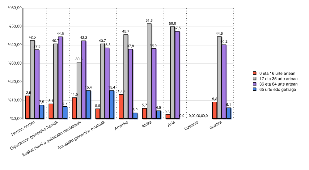 | Kontinentea | Guztira | 0 eta 16 urte artean | 17 eta 35 urte artean | 36 eta 64 urte artean | 65 urte edo gehiago | |||||