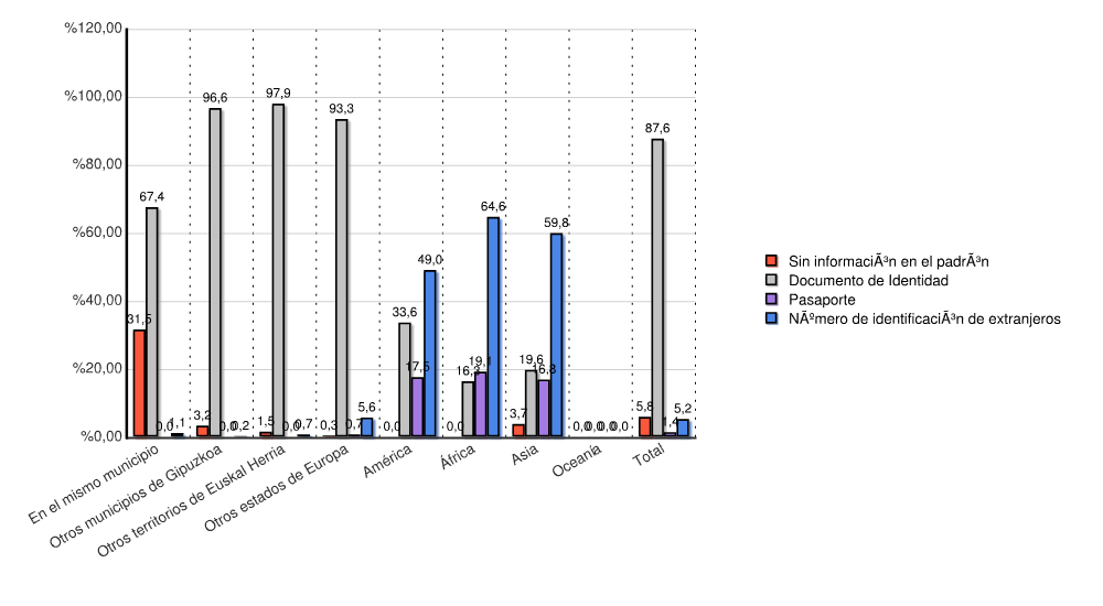 | Estado | Sin información en el padrón | Documento de Identidad | Pasaporte | Número de identificación de extranjeros | Total | |||||