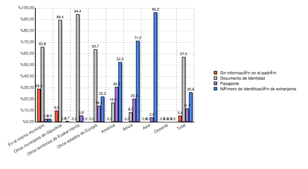 | Continente | Sin información en el padrón | Documento de Identidad | Pasaporte | Número de identificación de extranjeros | Total | |||||