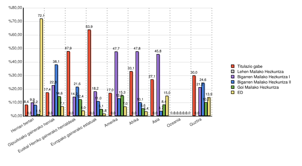 | Euskal Herriko gainerako herrialdeak | 291 | 47,9 | 0 | 0,0 | 86 | 14,2 | 131 | 21,6 | 75 | 12,4 | 24 | 4,0 | 607 | 100,0 |