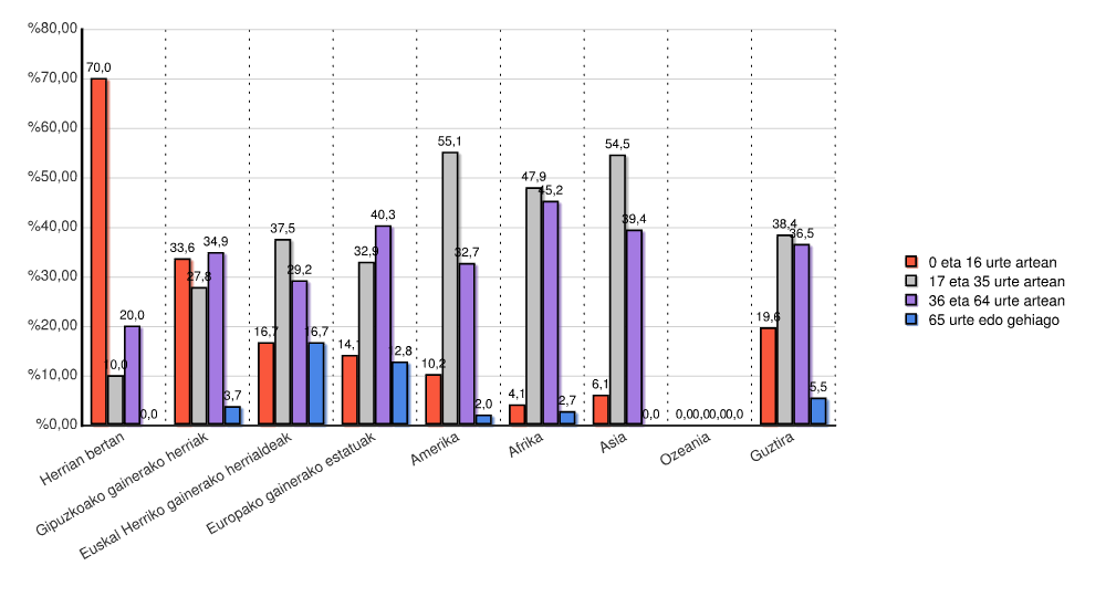 | Kontinentea | 0 eta 16 urte artean | 17 eta 35 urte artean | 36 eta 64 urte artean | 65 urte edo gehiago | Guztira | |||||