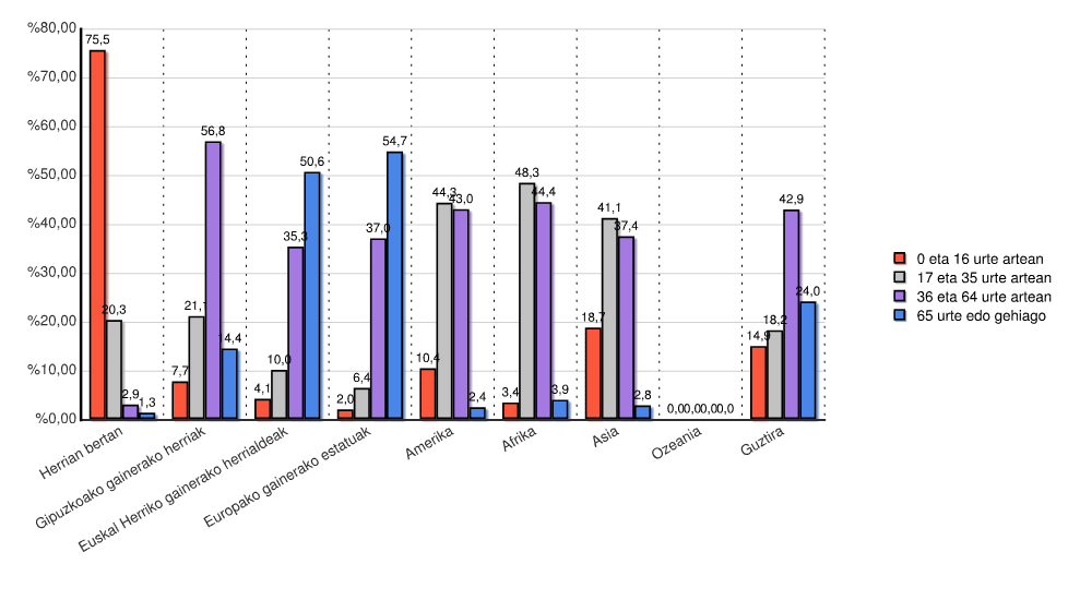 | Euskal Herriko gainerako herrialdeak | - | - | - | - | - | - | - | - | 346 | 57,0 | 68 | 11,2 | 107 | 17,6 | 86 | 14,2 | 607 | 100,0 |