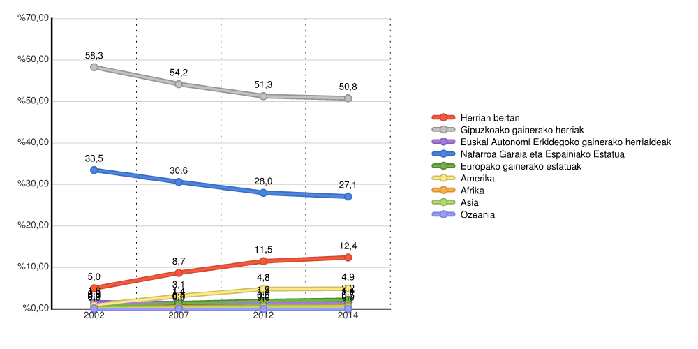 | Gipuzkoako gainerako herriak | 10.155 | 58,3 | 9.541 | 54,2 | 9.197 | 51,3 | 9.193 | 50,8 |