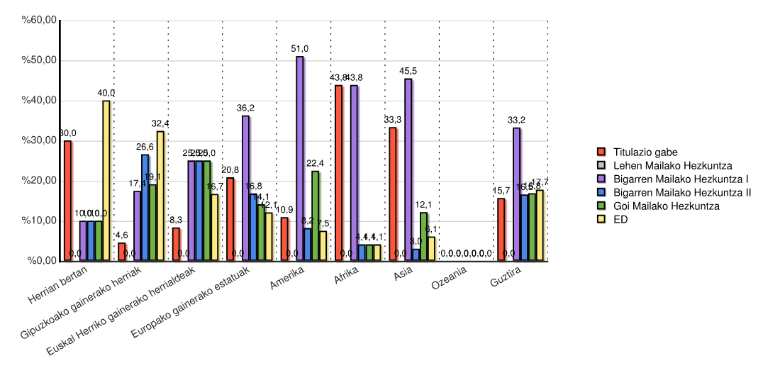 | Kontinentea | Titulazio gabe | Lehen Mailako Hezkuntza | Bigarren Mailako Hezkuntza I | Bigarren Mailako Hezkuntza II | Goi Mailako Hezkuntza | ED | Guztira | |||||||