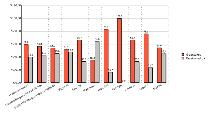 | Euskal Herriko gainerako herrialdeak | 13 | 54,2 | 11 | 45,8 | 24 | 100,0 |