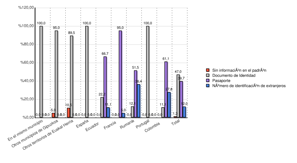 | Estado | Sin información en el padrón | Documento de Identidad | Pasaporte | Número de identificación de extranjeros | Total | |||||