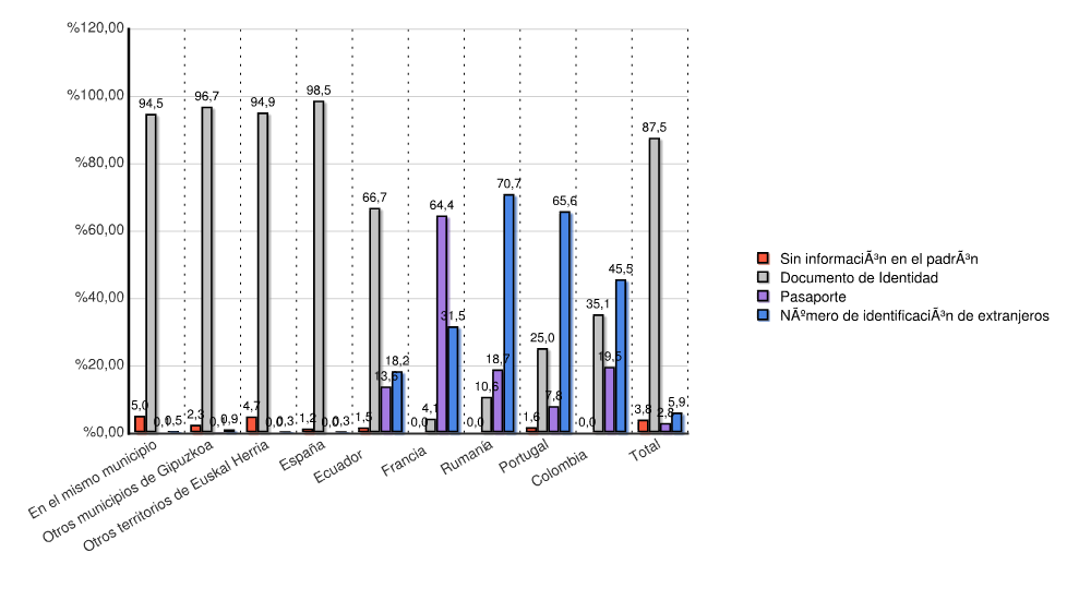 | Estado | Sin información en el padrón | Documento de Identidad | Pasaporte | Número de identificación de extranjeros | Total | |||||