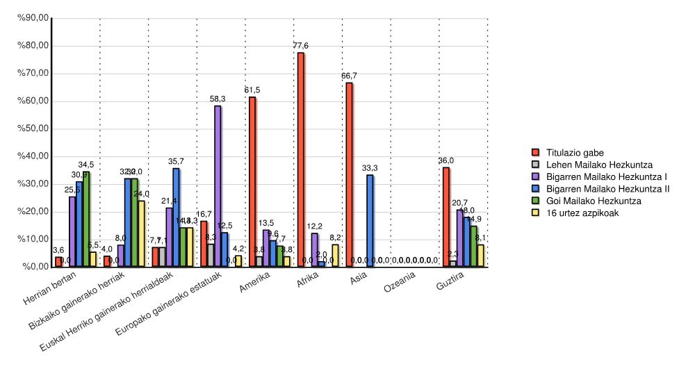 | Kontinentea | Titulazio gabe | Lehen Mailako Hezkuntza | Bigarren Mailako Hezkuntza I | Bigarren Mailako Hezkuntza II | Goi Mailako Hezkuntza | 16 urtez azpikoak | Guztira | |||||||