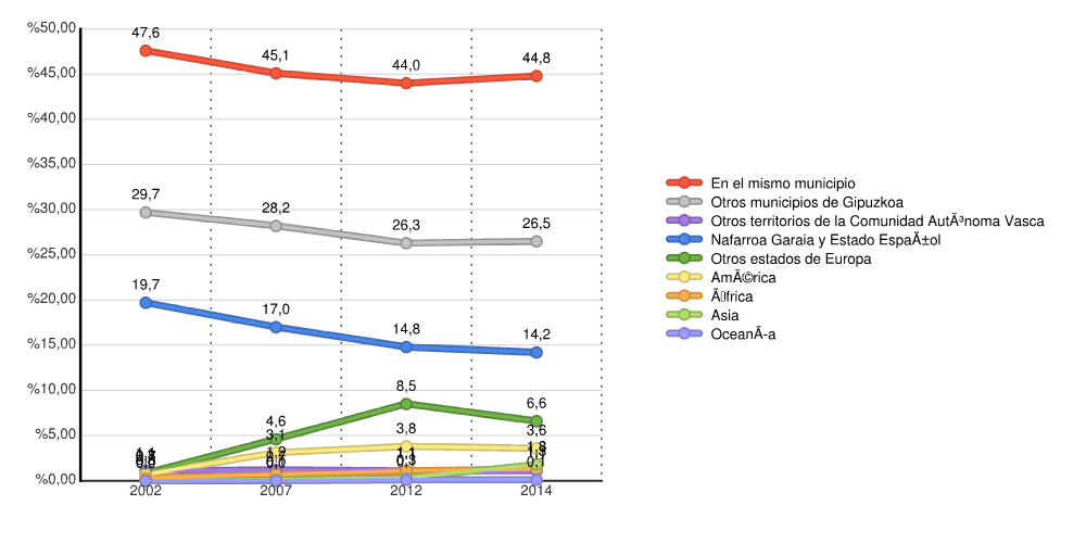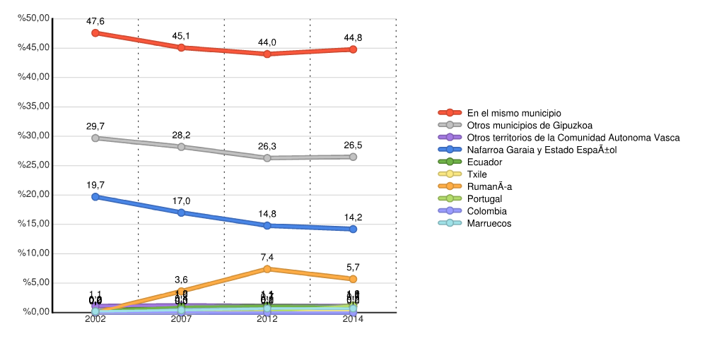 | Eskualdea | En el mismo municipio | Otros municipios de Gipuzkoa | Otros territorios de la Comunidad Autonoma Vasca | Nafarroa Garaia y Estado Español | Rumanía | Portugal | Marruecos | Ecuador | Txile | Colombia | Total | |||||||||||
