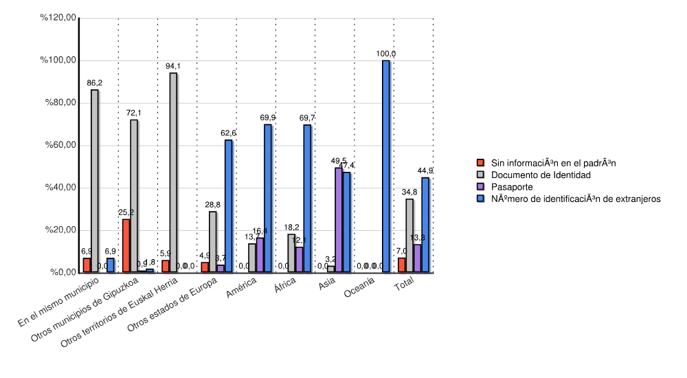 | Continente | Sin información en el padrón | Documento de Identidad | Pasaporte | Número de identificación de extranjeros | Total | |||||