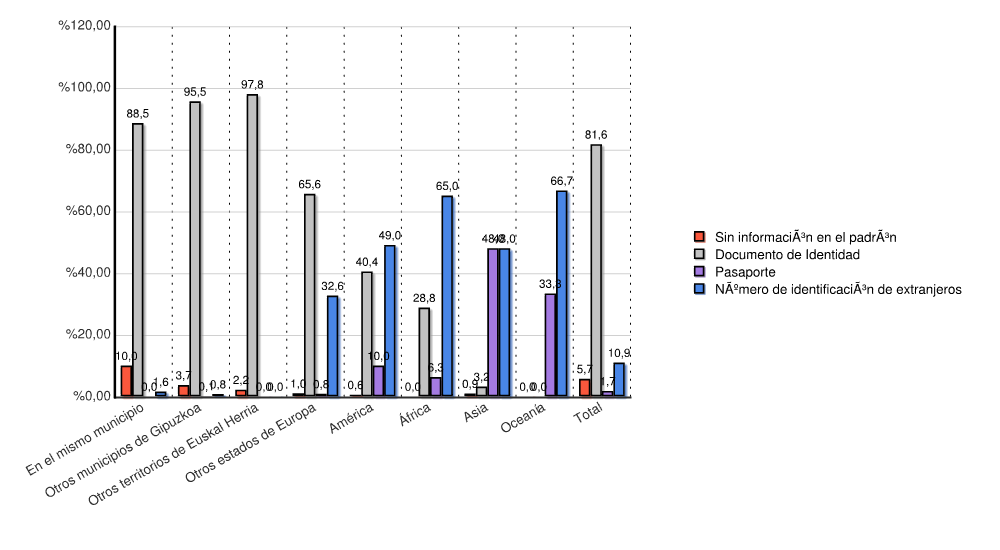 | Continente | Sin información en el padrón | Documento de Identidad | Pasaporte | Número de identificación de extranjeros | Total | |||||