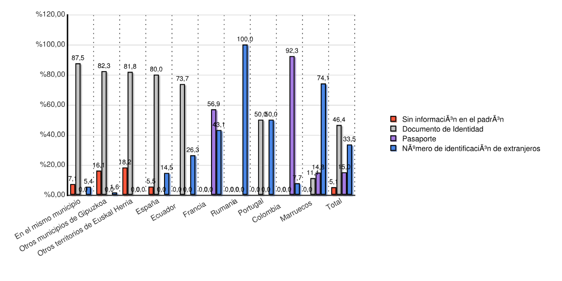 | Estado | Sin información en el padrón | Documento de Identidad | Pasaporte | Número de identificación de extranjeros | Total | |||||